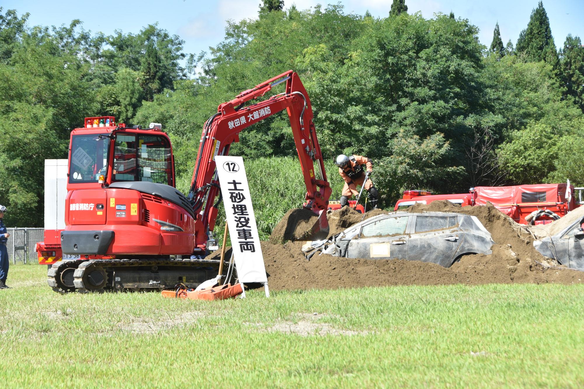 8月31日に、秋田県総合防災訓練が市役所周辺や総合運動公園駐車場などを会場に開催されました。本市での開催は、13年ぶり6回目であり、大雨や大地震による被害が発生したとの想定のもと、警察や消防、自衛隊、医療機関、自主防災組織など56機関・団体の関係者約800人が人命救助や避難所の開設など約20項目の訓練に参加しました。訓練のうち、総合運動公園駐車場で行われた人命救助訓練では、重機を使って倒壊した建物のがれき除去や、土砂に埋没した車両からの被災者救出のほか、被災者の救護訓練など、関係機関が連携した実践的な訓練が行われました。参加者は、激甚化・頻発化する災害への備えと防災意識を高めました。