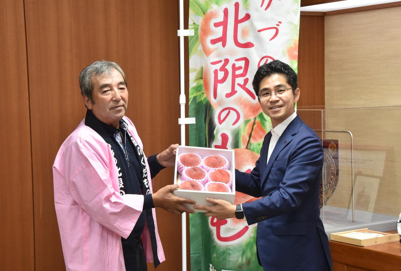 JAかづの北限の桃生産部会が、8月29日に、桃の生育状況を報告するため、笹本市長を訪れました。今年の生育状況について、中村喜作部会長は「少雨の影響で早生の品種は小さめで、収量も少なかったが、その後の雨により、主力品種の川中島白桃は、大きさも糖度も良い」と話しました。笹本市長も「甘くて、食べ応えがあり、思わずにっこりする」と舌鼓を打つおいしさです。