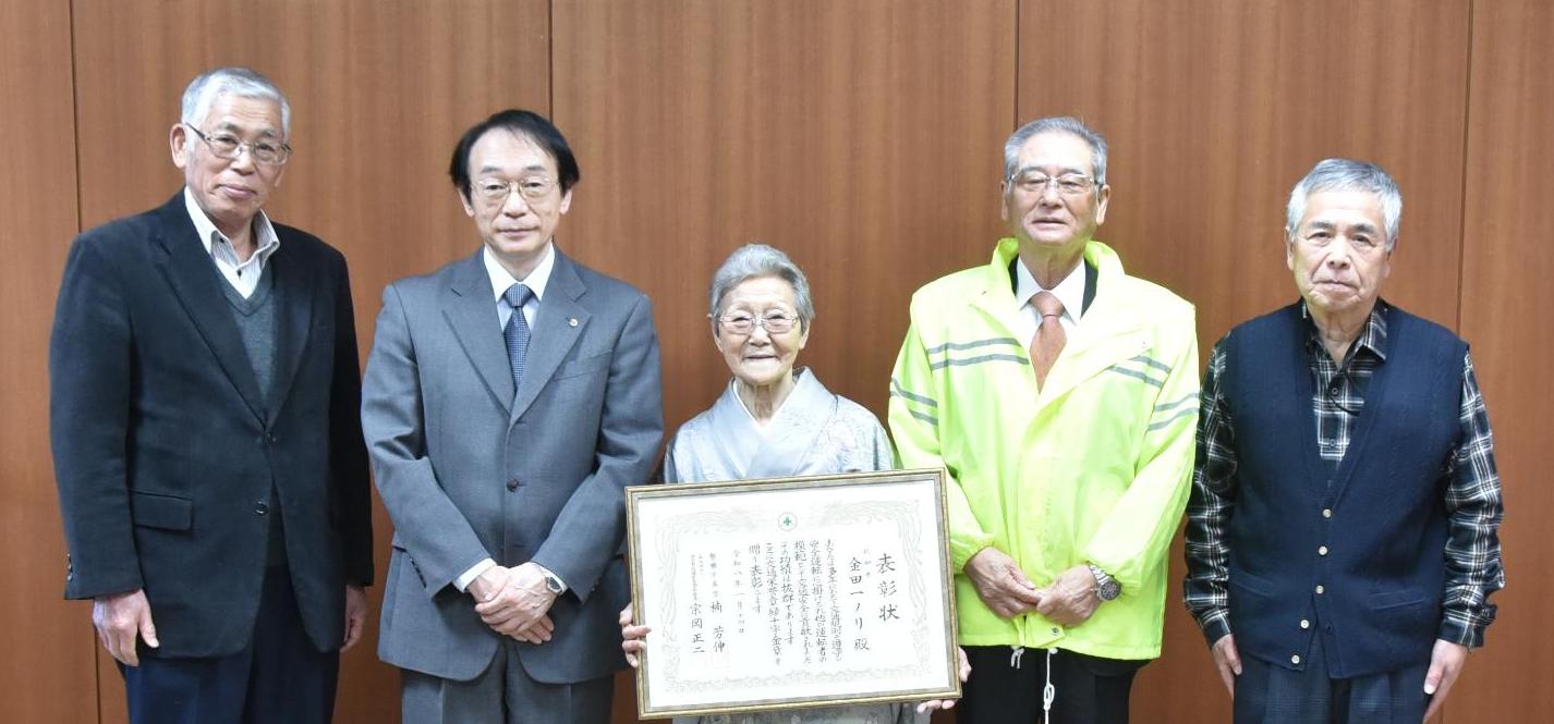 令和7年度交通栄誉章「緑十字金章」を金田一ノリさん(写真中央)が受章しました。金賞は個人に対する最高賞で、秋田県では唯一の受章です。金田一さんは、鹿角交通協会の活動を50年程続けており、昭和58年の婦人部の設立では先頭に立ち、その後、婦人部長を40年務め、地域の交通安全に尽力してきた成果が認められました。