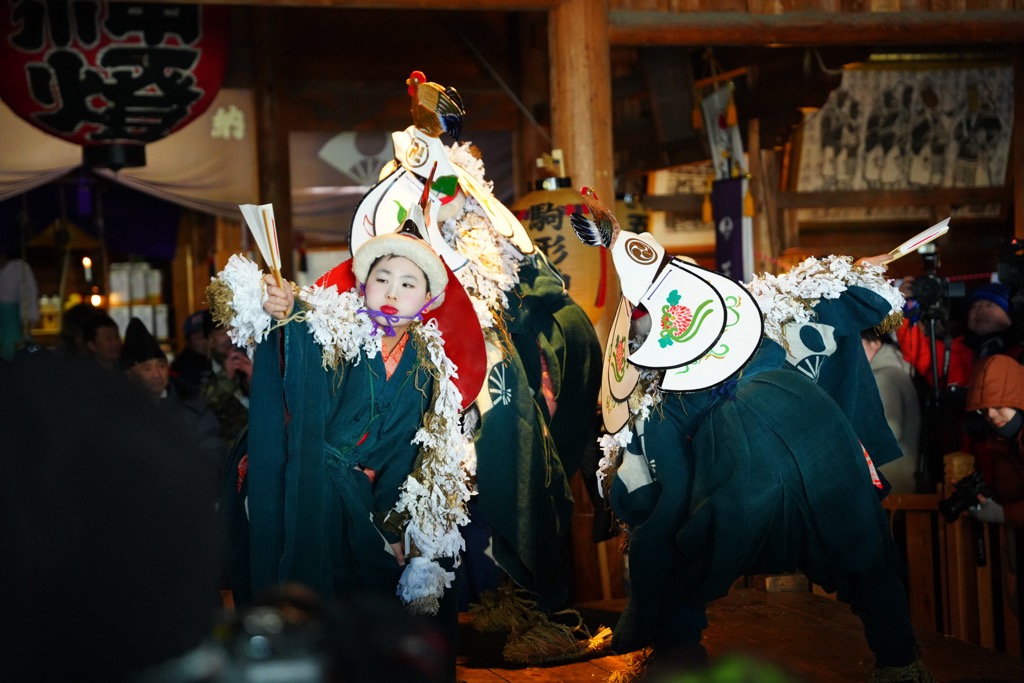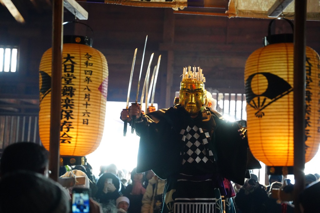 国の重要無形民俗文化財でユネスコ無形文化遺産にも登録されている市の伝統芸能「大日堂舞楽」が1月2日、大日霊貴神社に奉納されました。 大日堂舞楽の起源は、養老2(718)年に天皇の勅令で大日堂(大日霊貴神社)が再建された際に、都から下向した楽人が舞った祝賀の舞楽を里人に伝えられたものとされています。 籾押しや幡上げなど、さまざまな行事が行われた後、宮司により祝詞が奏上され、7つの舞が奉納されました。 本舞は、集落ごとに分担されており、大里地区が駒舞、鳥舞、工匠舞、小豆沢地区が権現舞、田楽舞、長嶺地区が烏遍舞、谷内地区が五大尊舞を伝承しています。 4集落の能衆は、それぞれが担う伝統の舞を披露し、参拝客など多くの人が、その舞に見入っていました。