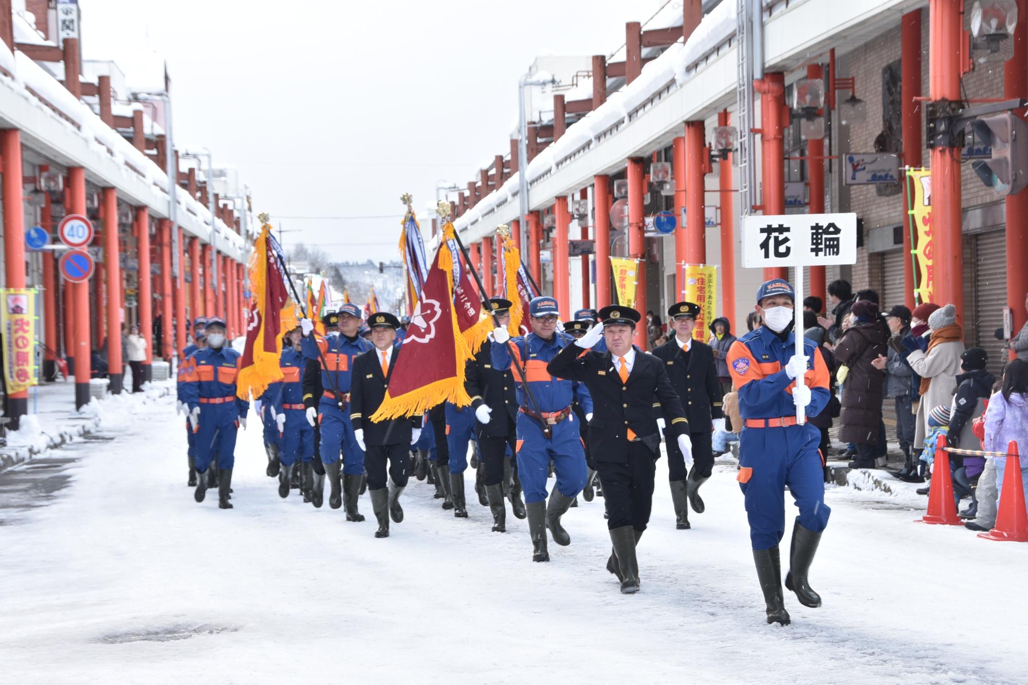 消防出初め式が1月4日に、文化の杜交流館コモッセと花輪地区の商店街で行われました。コモッセでは、無火災を祈願する神事や功労者の表彰などが行われ、花輪地区の商店街では、消防団員によるまとい振りや分列行進が披露されました。寒さが厳しい中、力強く行進などに臨んだ消防団員は、防火への意識を新たにしました。