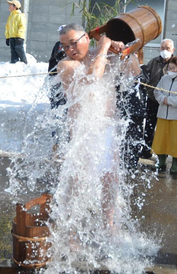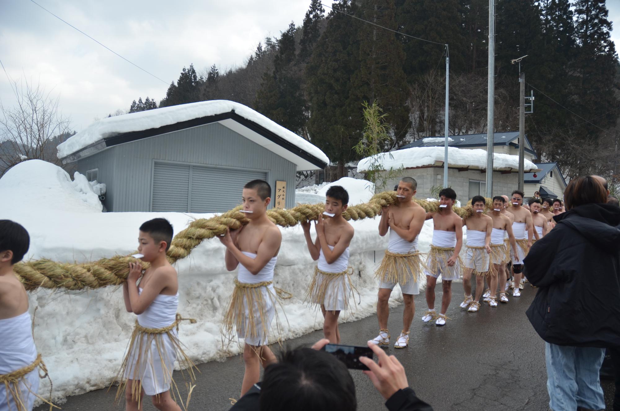 十和田末広地区の土深井集落に伝わる土深井裸まいりが2月15日に行われました。2年に一度行われるこの伝統行事は、江戸時代初期から受け継がれているもので、下帯一枚の男衆が冷たい沢水をかぶって身を清めた後、早朝から丹念に作った大きなしめ縄を稲荷神社の鳥居に奉納し、五穀豊穣、無病息災などを祈願しました。