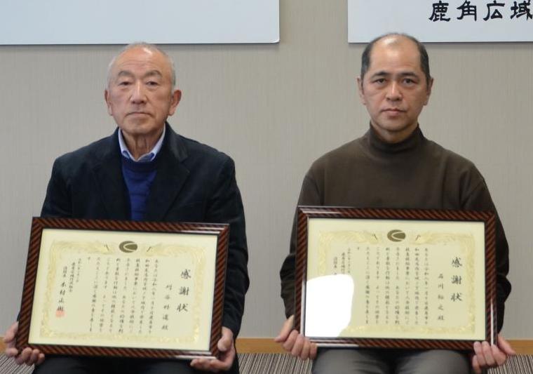 1月に自宅の屋根の雪下ろし中に転落し、全身が雪に埋まった隣人の人命を救助したとして、消防本部から、刈谷好道さん(写真左)と石川裕之さん(写真右)、ひとみさん夫妻に感謝状が贈られました。刈谷さんは「人を助けられたことを誇りに思う」、石川さんは「無我夢中で雪を寄せ、助けられて良かった」と話していました。