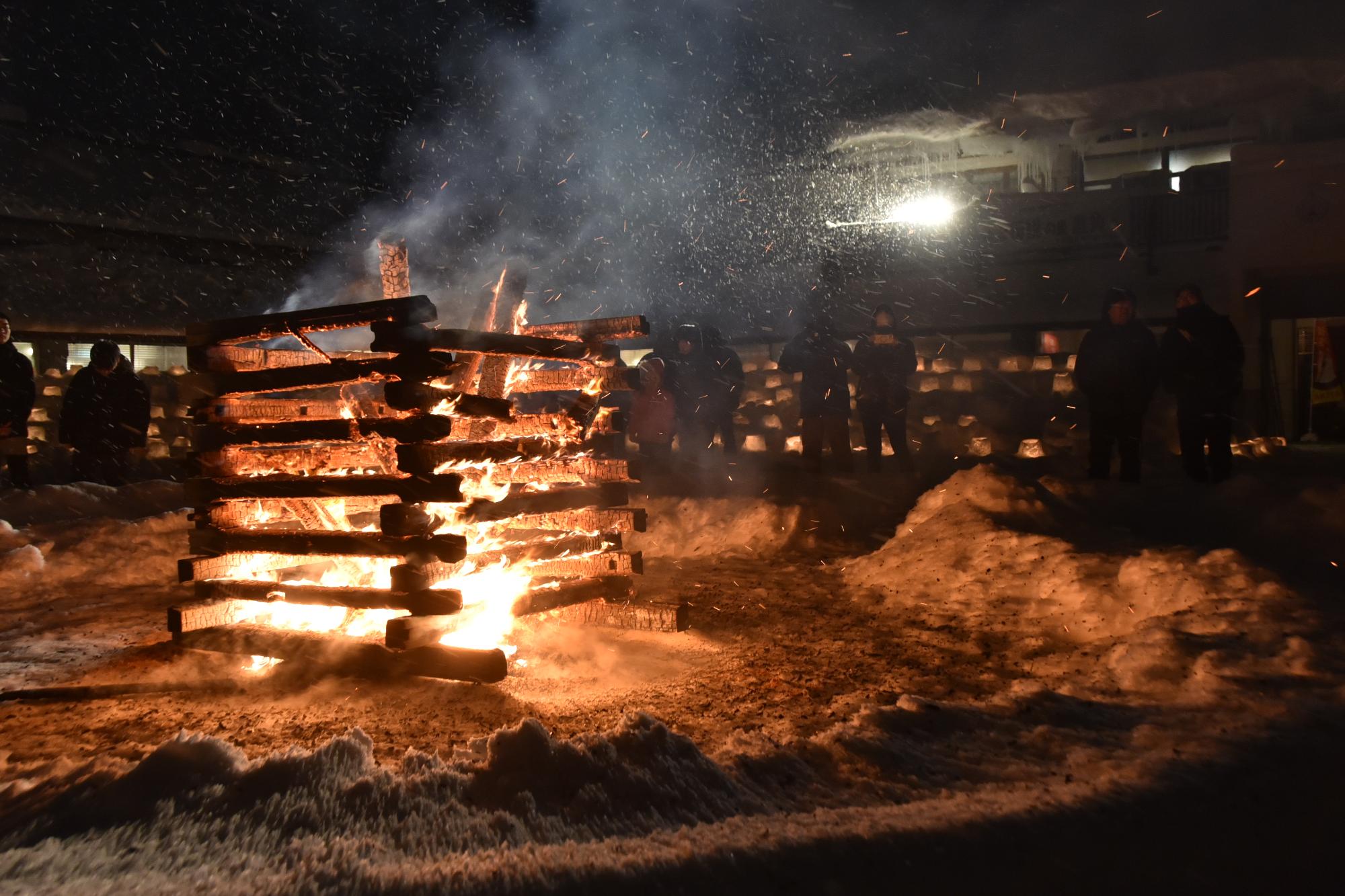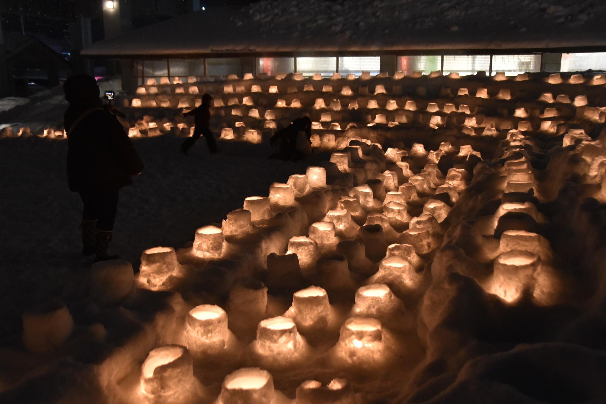 雪で作ったスノーキャンドルの明かりが幻想的にライトアップされる「焚き火&キャンドルナイト」が2月7日、道の駅かづの「あんとらあ」で開催されました。このイベントは7年目を迎え、例年以上の大雪となった今年の会場には、約800個のキャンドルが並べられました。 夕方になり日が沈むと、キャンドルと広場中央に設置された焚き火台に明かりが灯され、会場を温かく優しい光が包みました。その幻想的な空間の中で、津軽三味線奏者の渋谷幸平さんによる特別ライブと大曲の花火職人による冬花火ショーが行われ、迫力ある音色と大輪の花火が会場に華を添えました。 また、会場では、花輪中学校の生徒が考案した「かづの北限の桃」を使ったミルクシェイクなどが販売されるなど、来場者が寒い冬のひとときを思い思いに楽しむ姿が見られました。